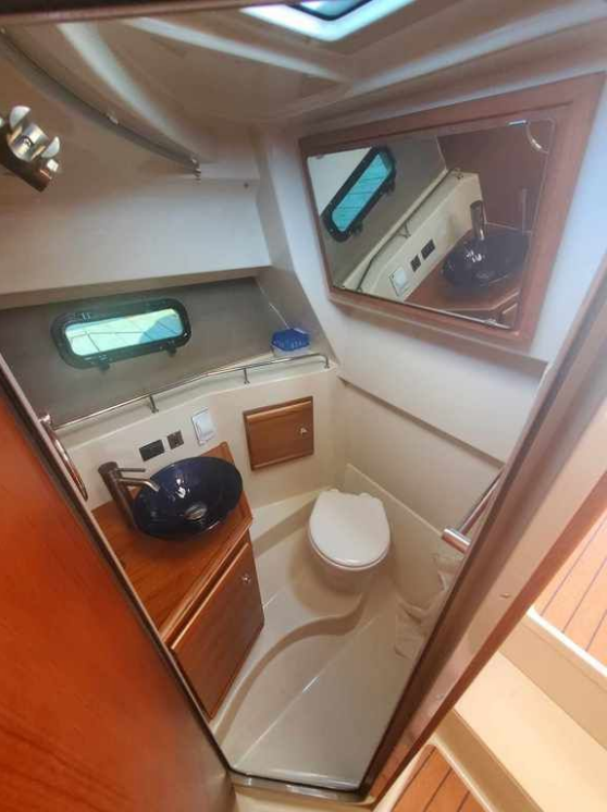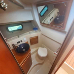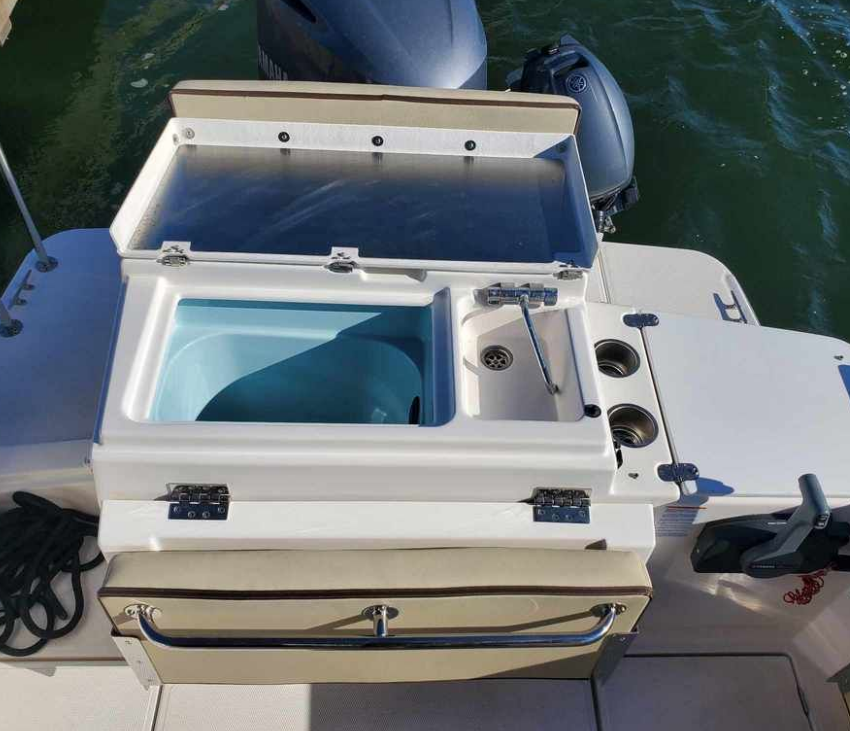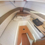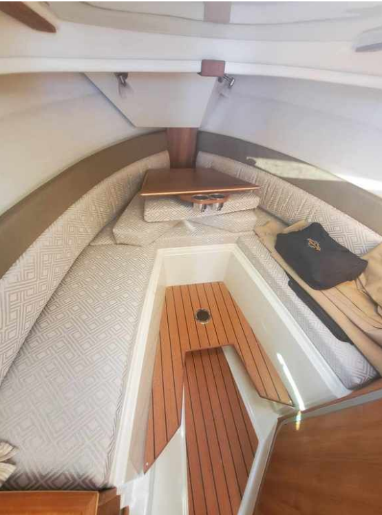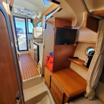 The curved front windshield and overhead glass atrium provide beautiful 360 degree views and generous light throughout the salon. Open the aft glass bulkhead in tandem with any of the hatches, windows, or port lights to deliver a fresh breeze throughout the cabin. Chefs will be delighted to cook in the full galley complete with a propane stove and oven with broiler, or to simply grill on the removable electric Kenyon grill. When taking in a gorgeous sunset, you and your guests can enjoy the view from the spacious cockpit or from the new double lounge seat on the bow of the R-27.