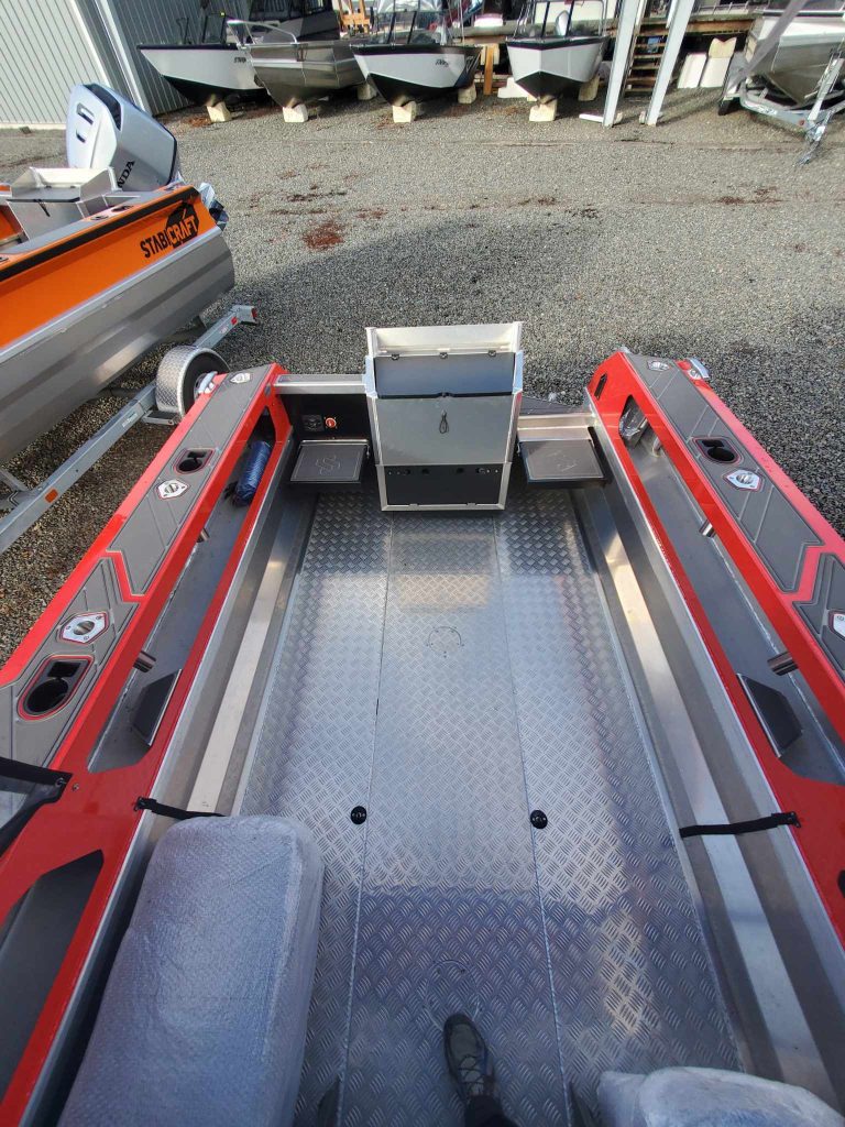 This Stabicraft 2050 Supercab Adventure is finished in Stage 1 Red paint and built on Stabicraft’s fully welded chambered hull, with sealed, airtight chambers that provide inherent buoyancy as part of the boat’s structure. This construction enhances safety and contributes to the solid, stable feel Stabicraft is known for. The Supercab Adventure layout offers practical protection from the elements, paired with a plate deck floor designed for durability and secure footing.