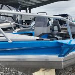 The layout includes a plate deck floor for solid footing, a transom livewell, and a Skipole bait board with integrated tackle storage to keep gear organized. A bow-mount electric trolling motor mount and forward casting platform support precise boat control and effective fishing, while raised bow rails and coaming handrails add security moving around the boat. This 1550 Frontier is a clean, functional package available now at Boat Country.