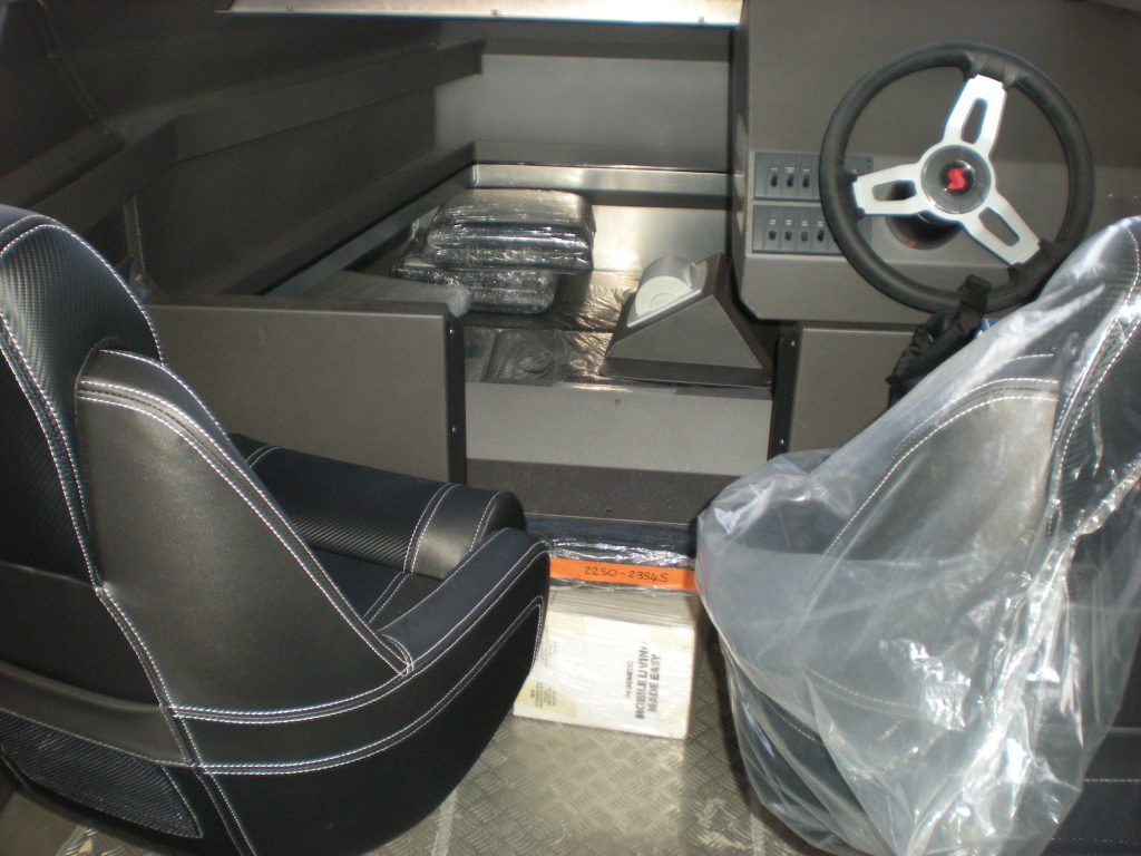 Power comes from a Honda BF250, delivering smooth, reliable performance with excellent fuel efficiency. The helm is set up with suspension pedestal seats for impact absorption offshore, complemented by Elite bolster seats and troop-style fold-down passenger seating for flexibility when carrying crew. A well-balanced offshore package that blends comfort, function, and capability—available now at Boat Country.