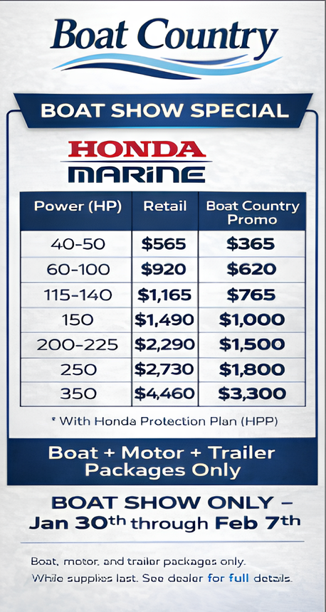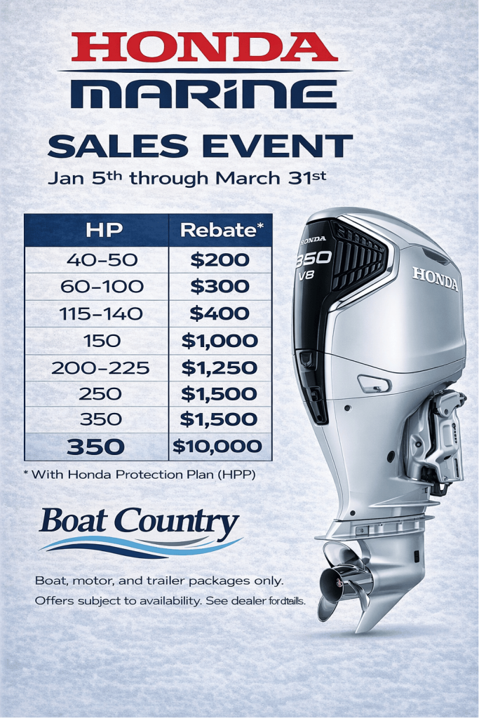 The Honda Marine Sales Event runs from January 5th through March 31st and is subject to availability. Eligible models and rebate amounts are determined by horsepower class as shown in the promotion. We encourage customers to call Boat Country or stop by the dealership to review current inventory, confirm eligibility, and speak with our knowledgeable team about building the right package for their boating needs. Our staff is happy to walk you through the details and help you take advantage of this limited-time opportunity.